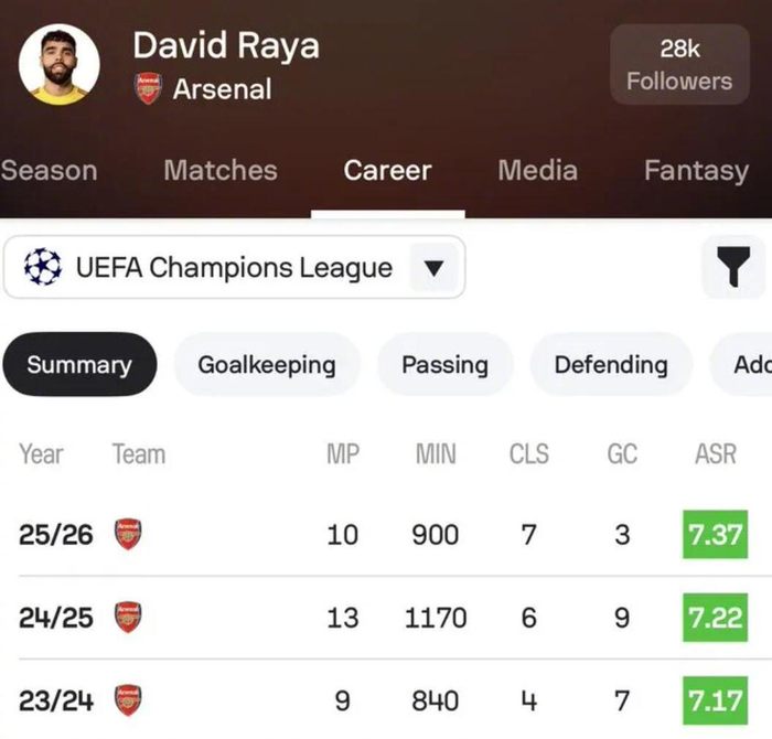 在此期间,拉亚出战的32场欧冠联赛里,有17场保持零封,场均失球数只有0.59个。
